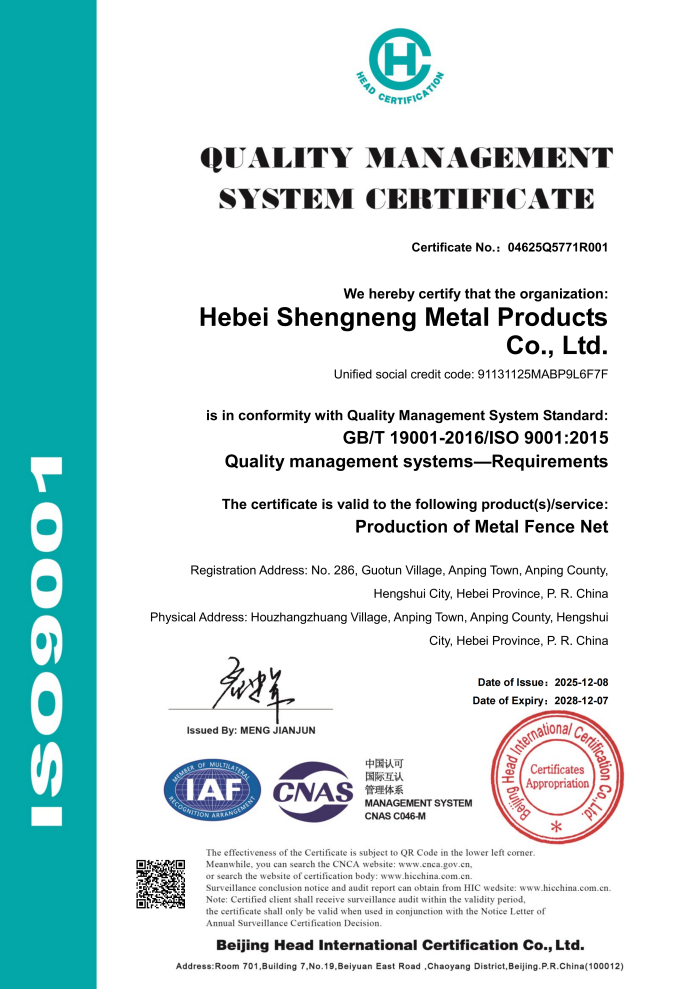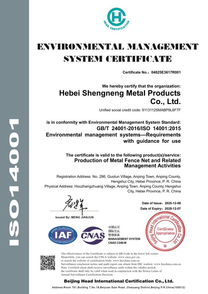ООО Хэбэй Шэннэн Металлоизделия, базирующееся в уезде Аньпин – родине проволочной сетки, является комплексным производственным предприятием, специализирующимся на исследованиях, разработке, производстве и продаже такой инфраструктурной продукции, как сетка, ограждения, стойки. Мы придерживаемся деловой философии «качество – основа, честность – крылья», опираясь на уникальные промышленные преимущества и передовые производственные технологии, предоставляем клиентам по всему миру безопасные, долговечные и эстетичные инженерные решения. Продукция широко применяется в таких областях, как инфраструктура, ландшафт, транспортная защита, экспортируется во многие страны мира, являясь надёжным и образцовым брендом в отрасли.